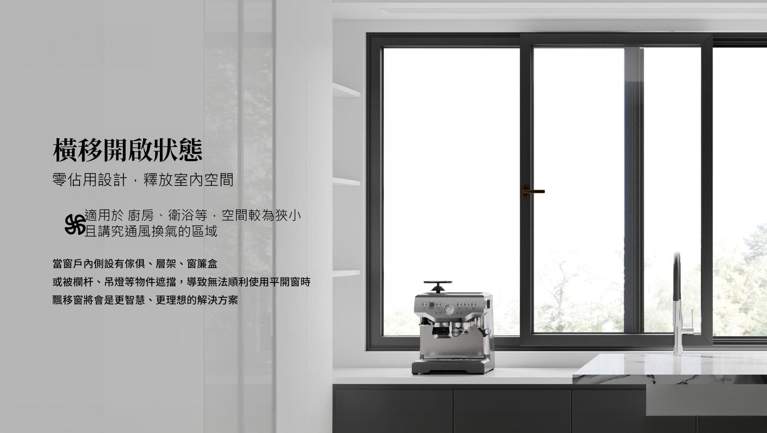 適合廚房通風使用,內倒模式可實現日常通風;平移側開,可閃避水龍頭位置,縮小平開空間,將空間使用極大化。