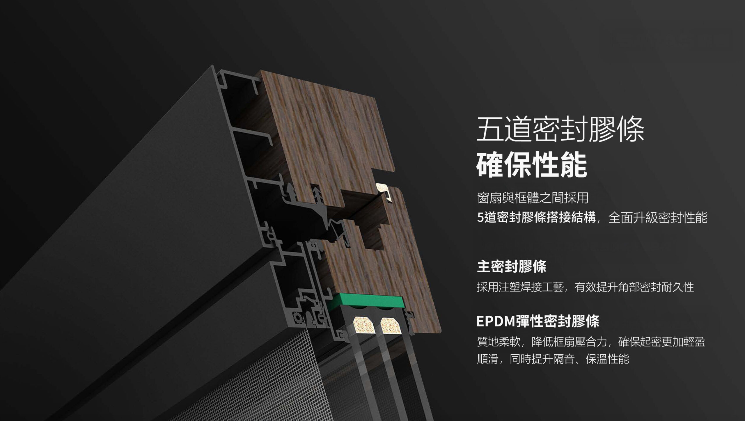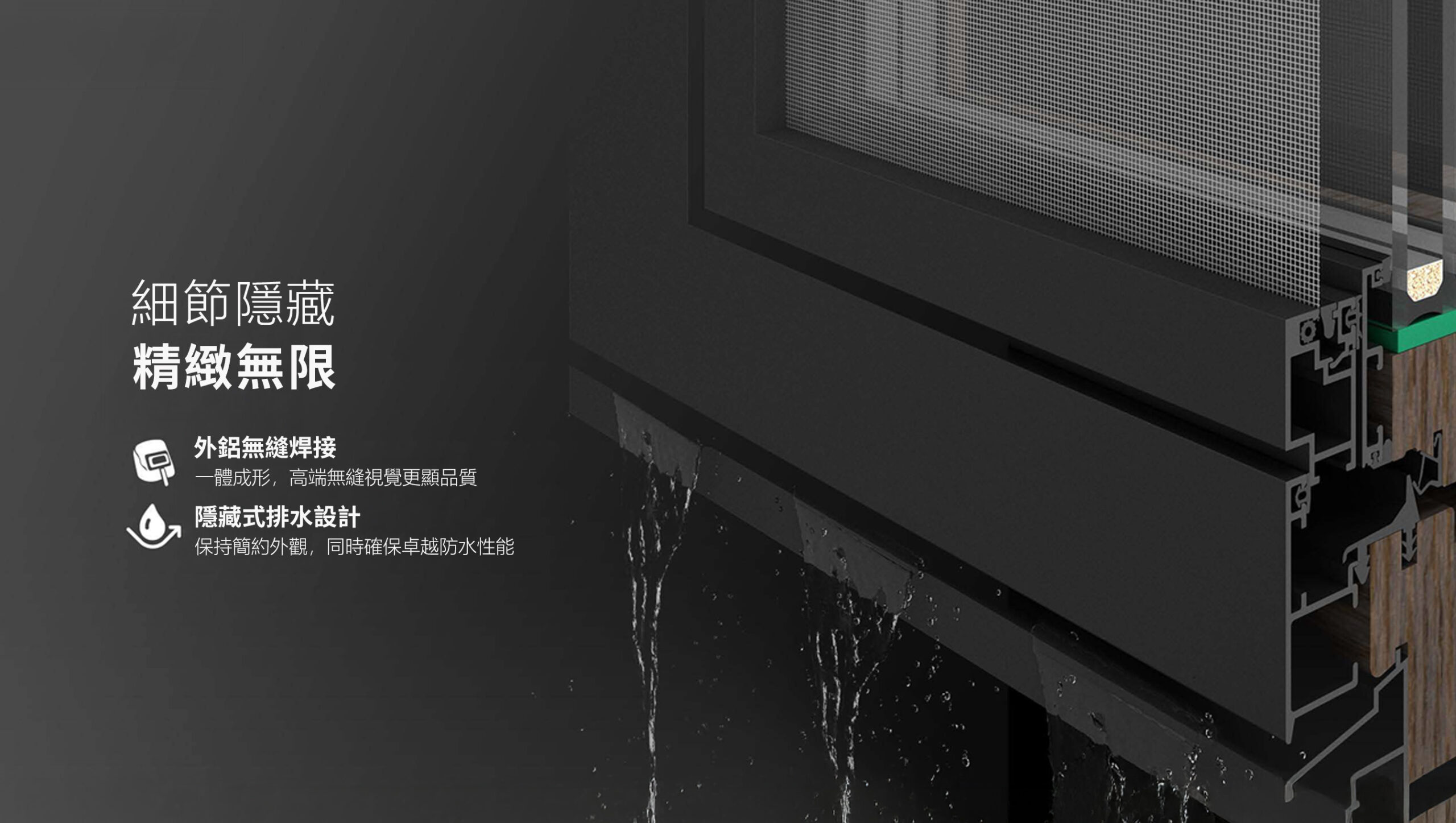 外鋁框體採用無縫焊接專利技術,使框面渾然一體,美觀且大幅提升密封耐久性