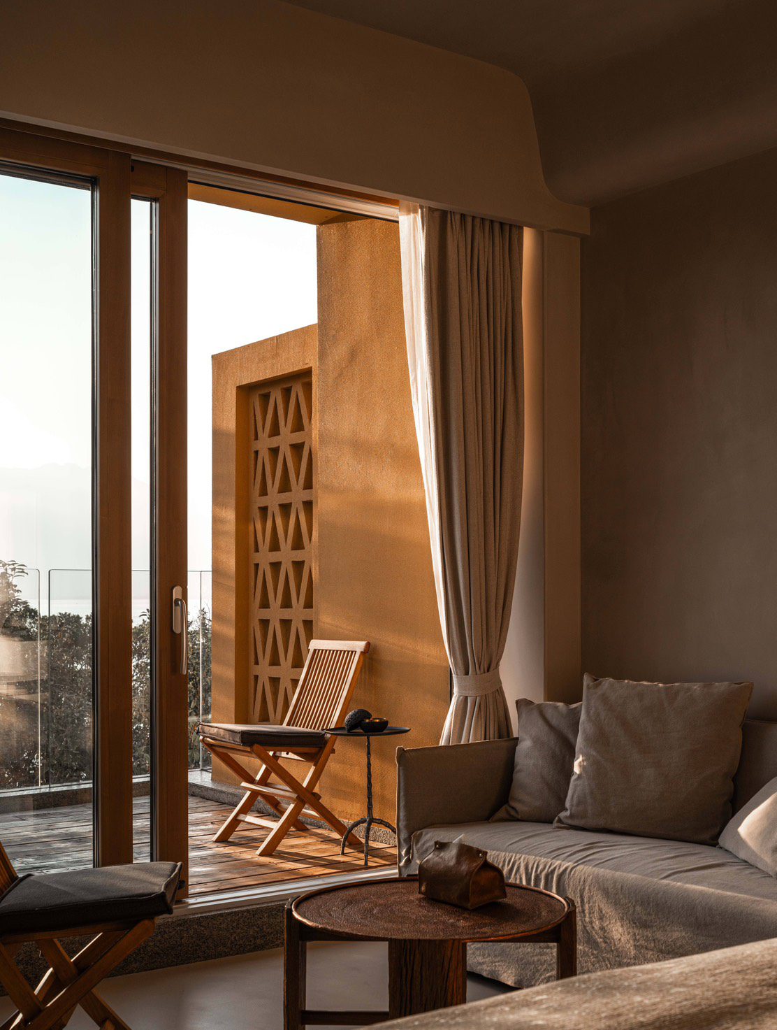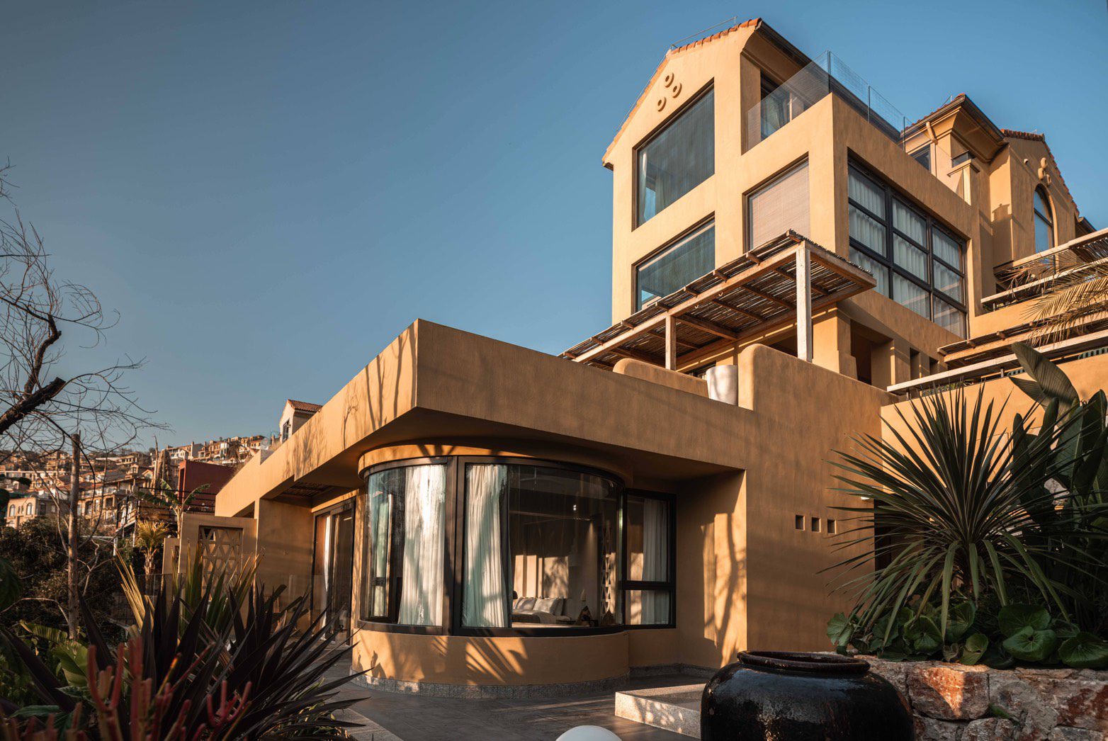 建築外立面是溫潤的砂黃色,搭配原木元素,自然地融入了洱海畔的光影裡。