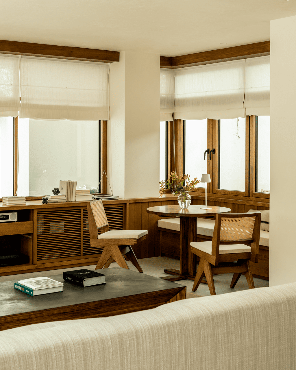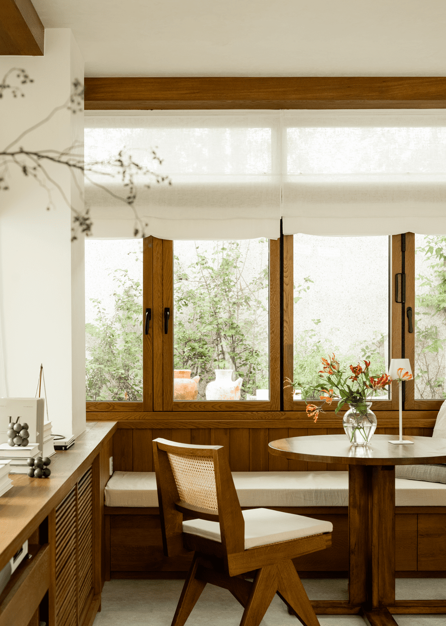 楓葉鋁木窗 – 在餐廳與廊道空間,選用極細框鋁包木窗系統,外側的鋁材耐候抗潮,內側的複合實木材,木質帶來溫潤的觸感與優雅的視覺,這是高級別墅裝修中平衡美觀與實用性的最佳選擇。