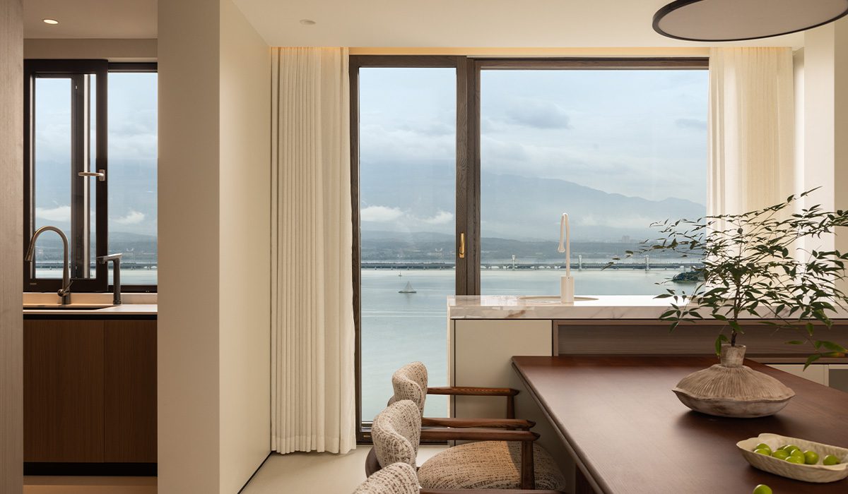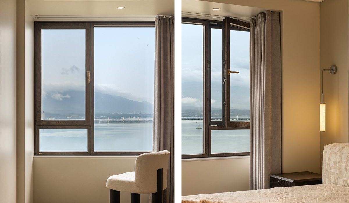 兼顧機能與美感: 考慮到居住的舒適度,設計師將通風功能規劃在兩側的落地開啟扇,既保證了流暢的通風採光,又不破壞正面湖景的完整性。