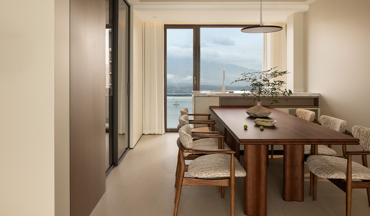 窗框的木質色調與室內的木質餐桌、圓弧茶几精準匹配,營造出一種「由內而外」的一體感。